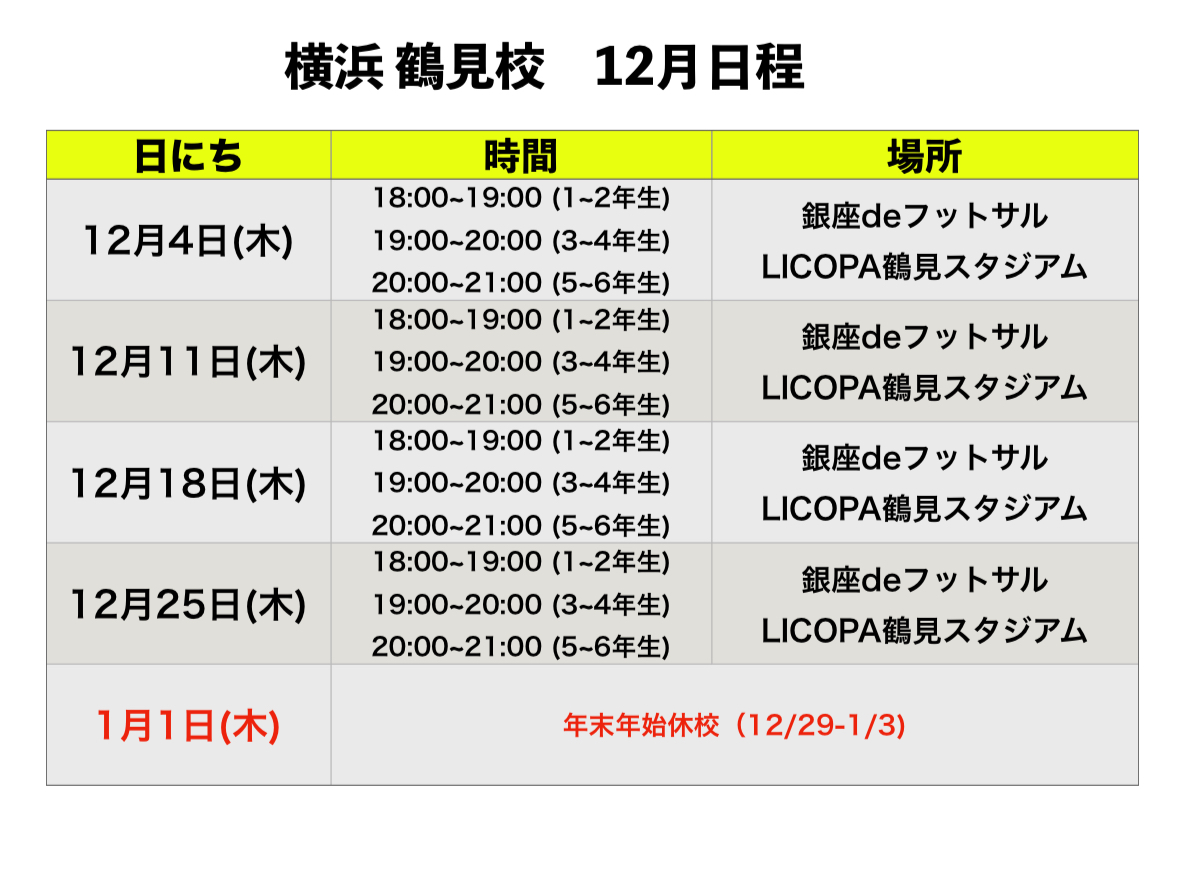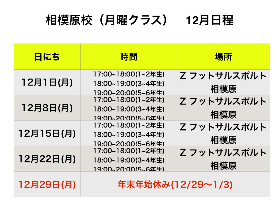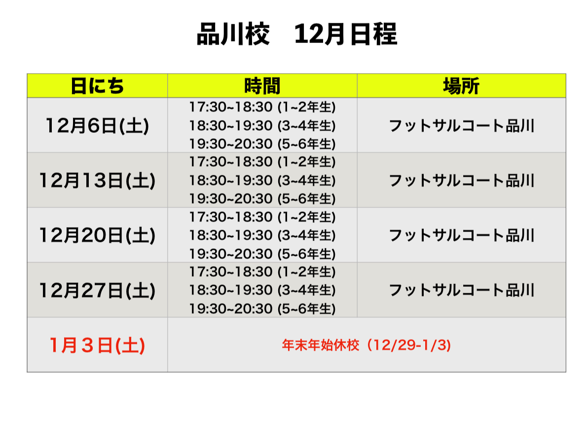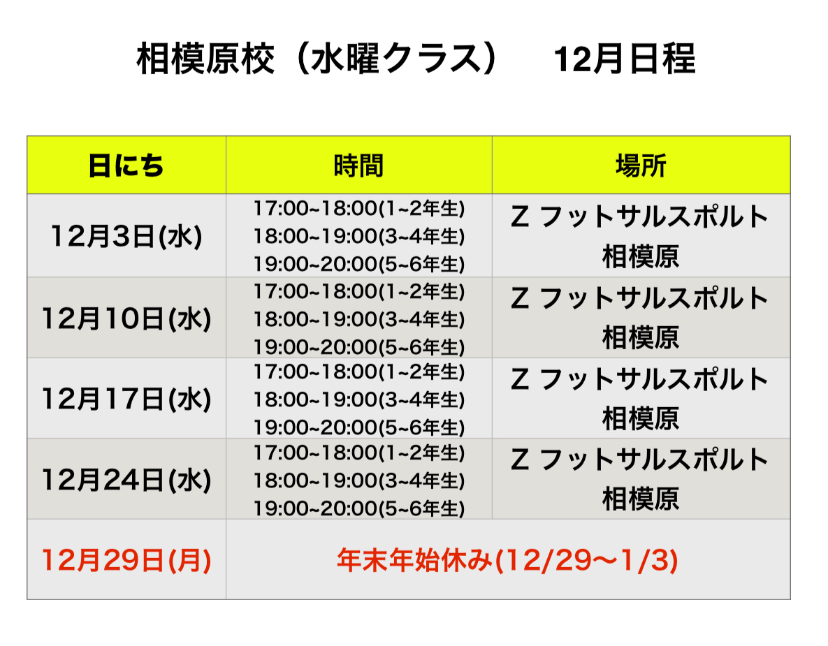 関東地区 12月 スクール日程