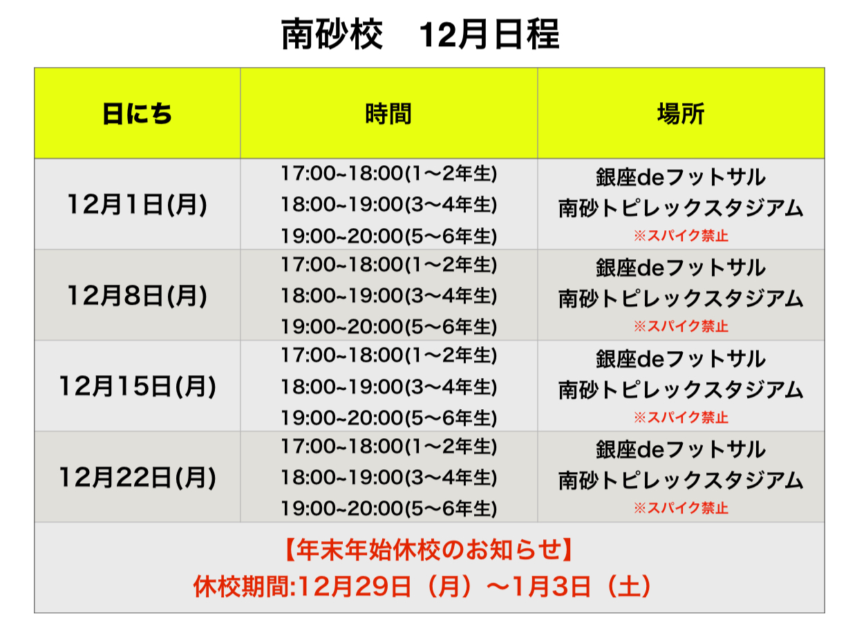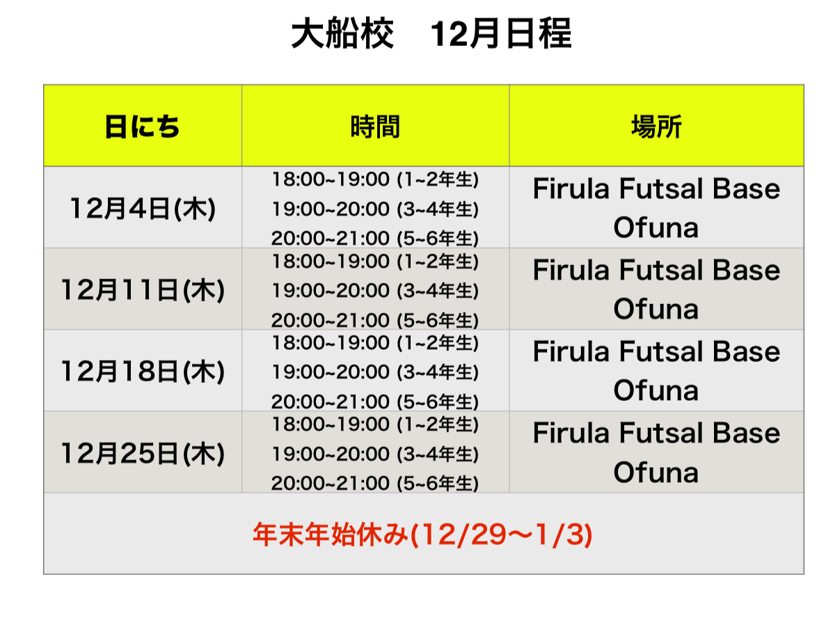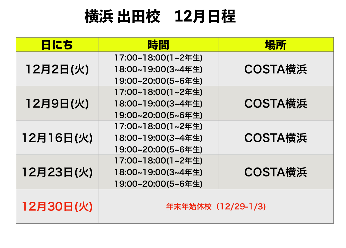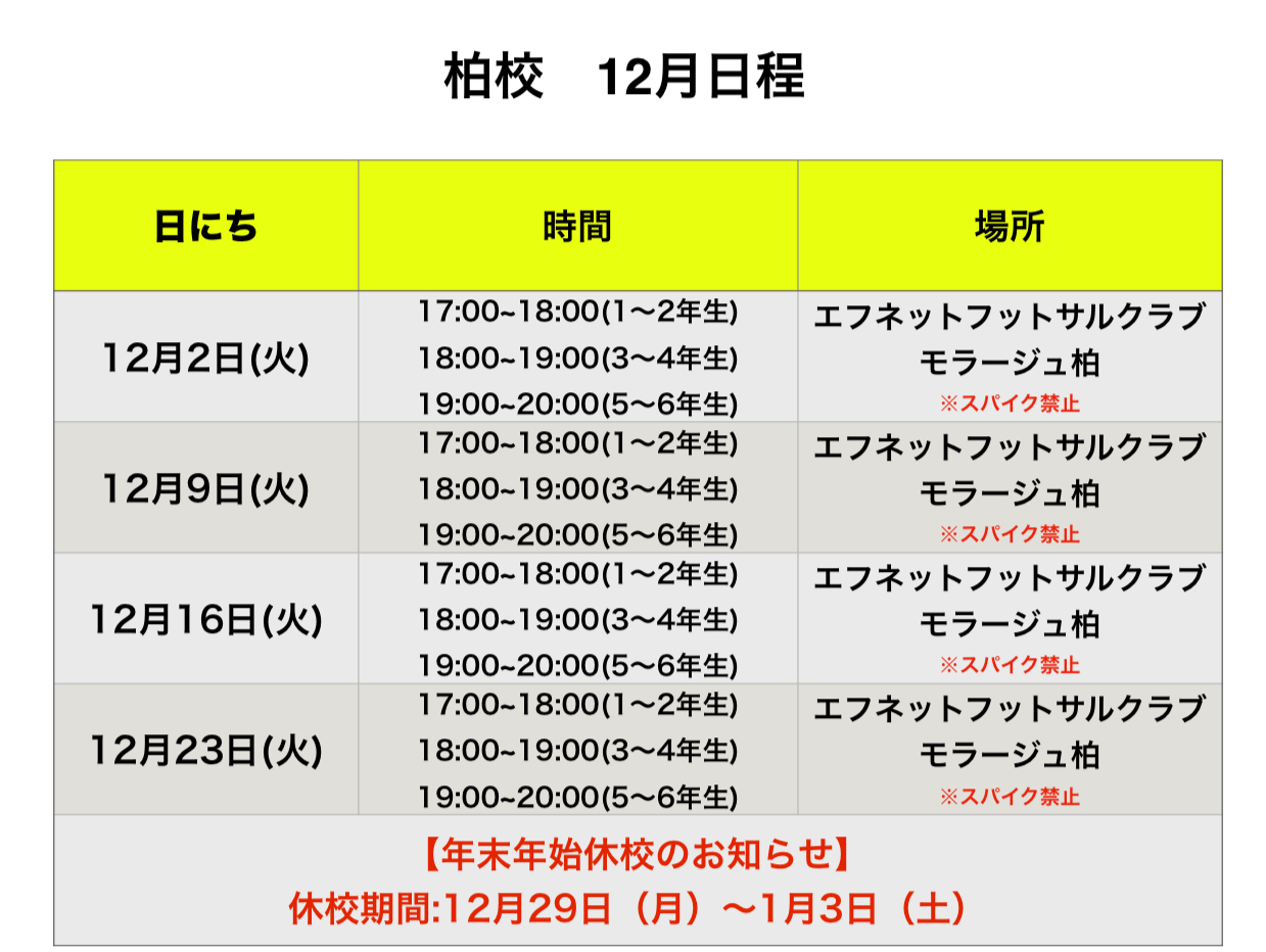 関東地区 12月 スクール日程