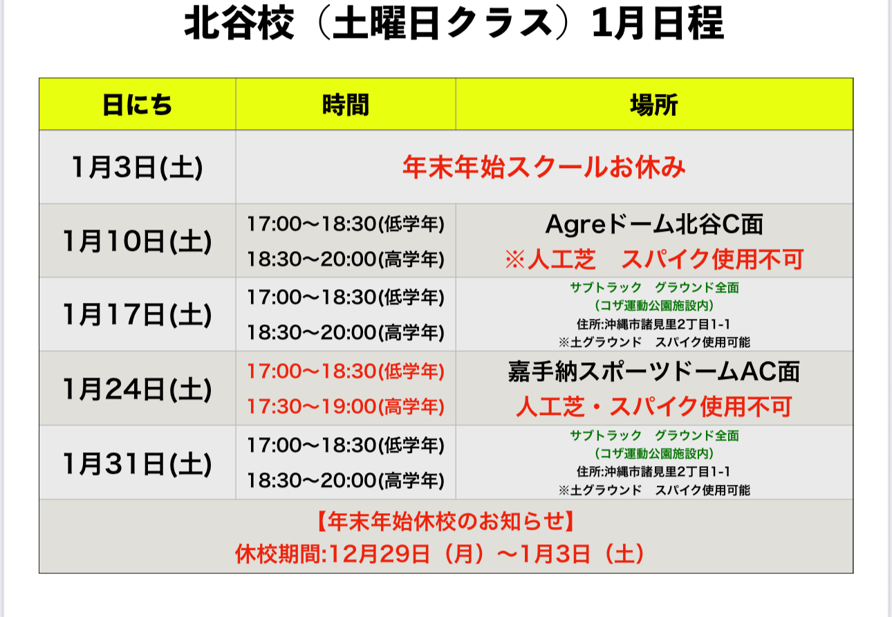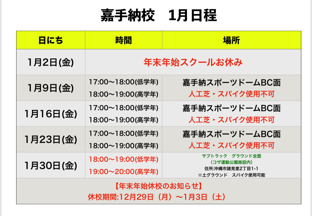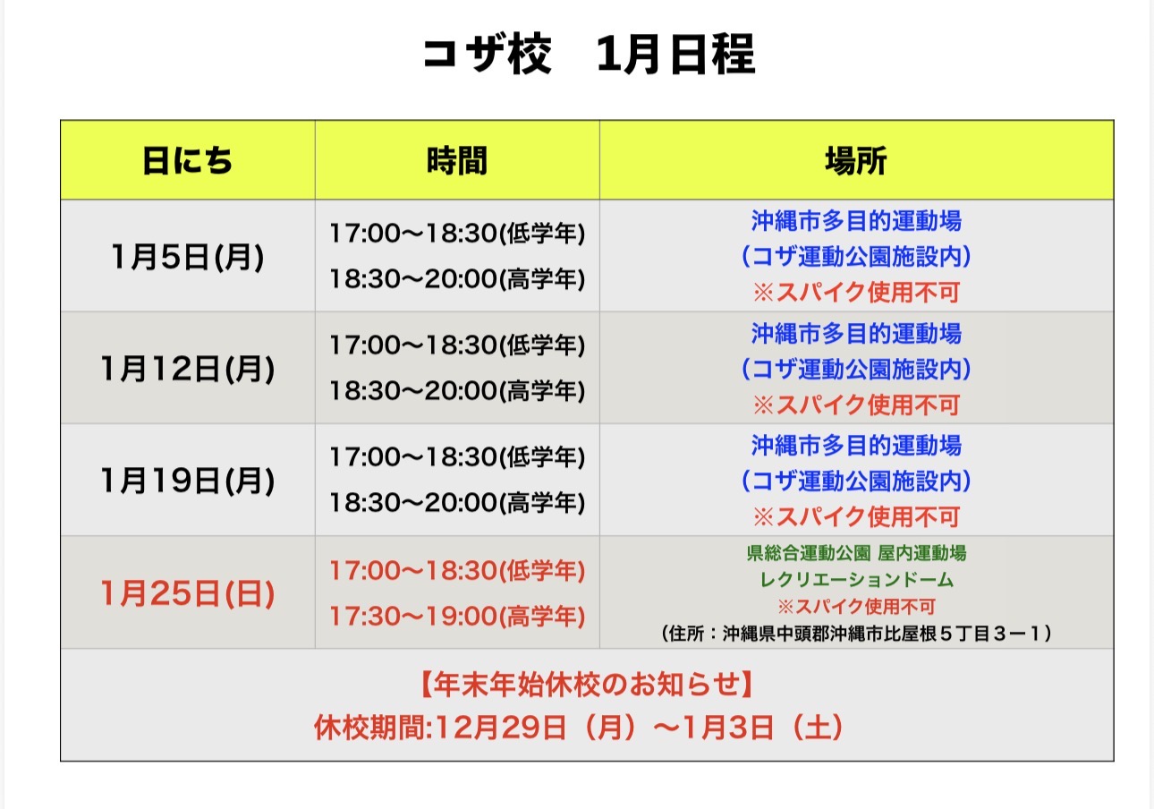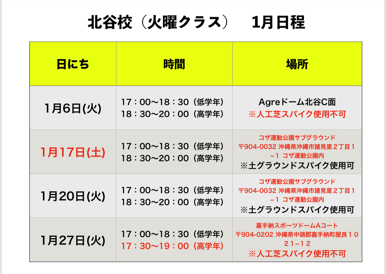 沖縄地区 1月 スクール日程