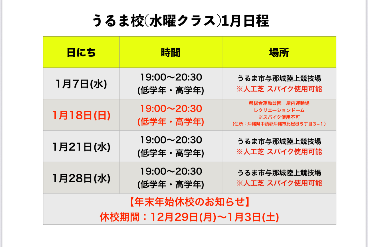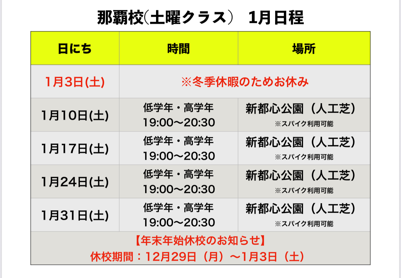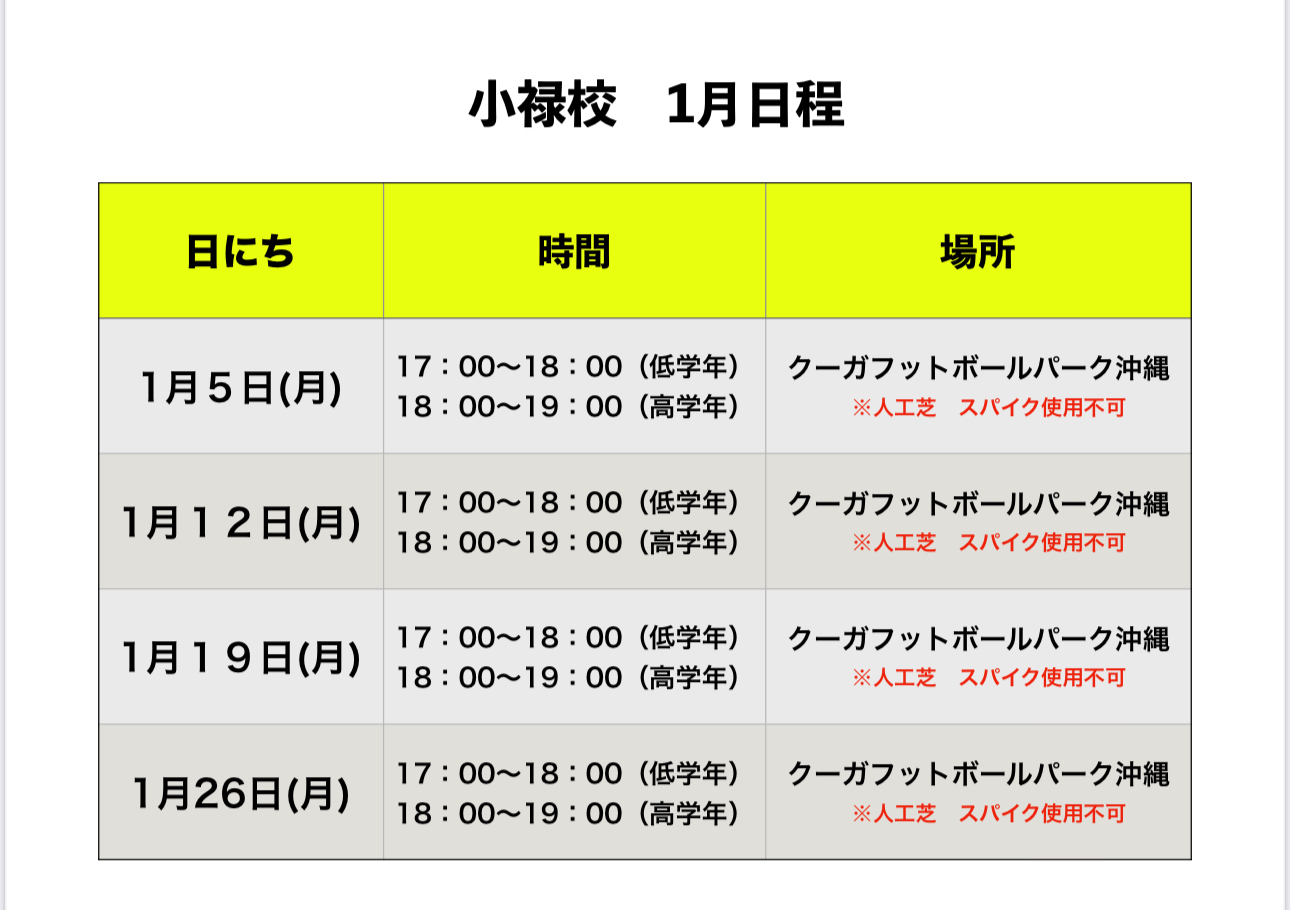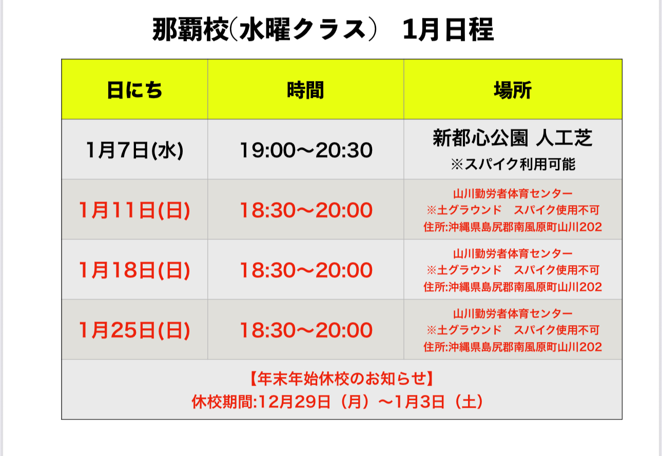 沖縄地区 1月 スクール日程