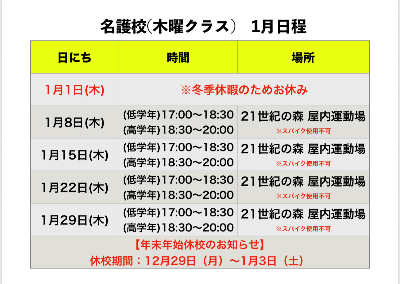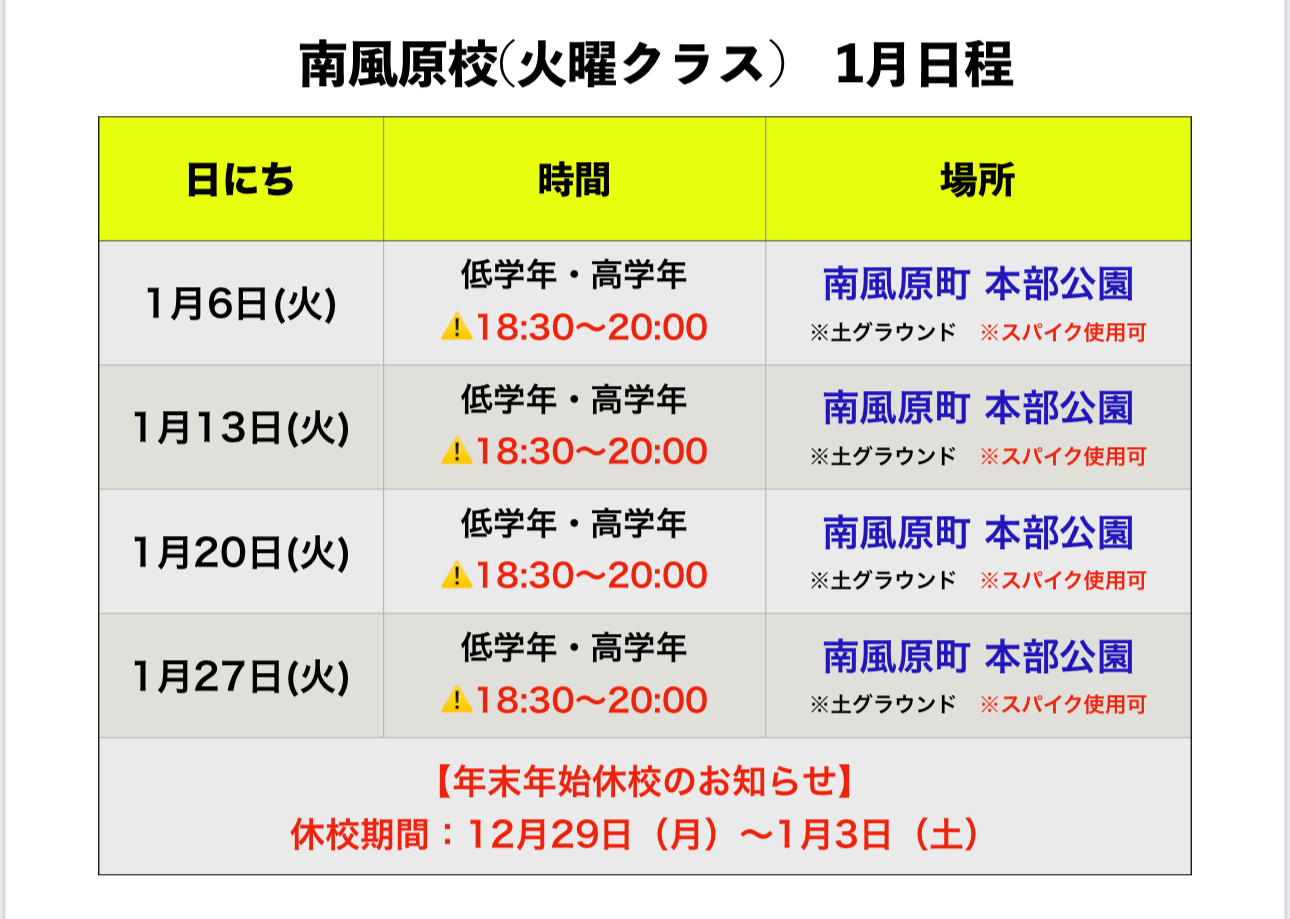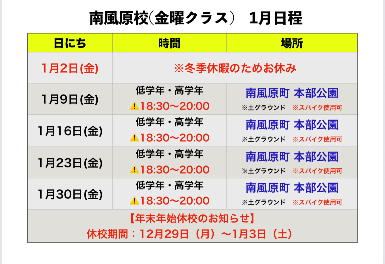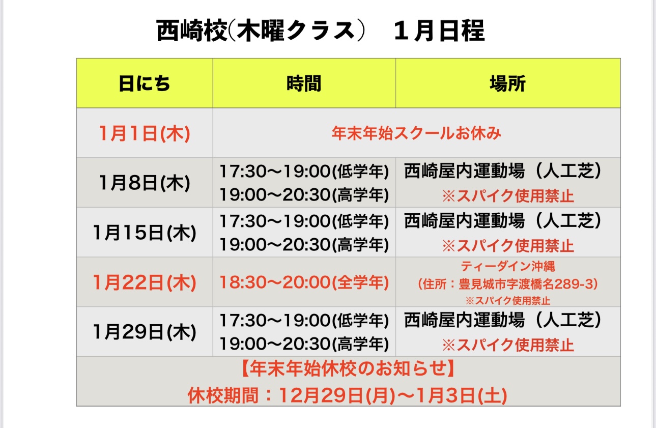 沖縄地区 1月 スクール日程